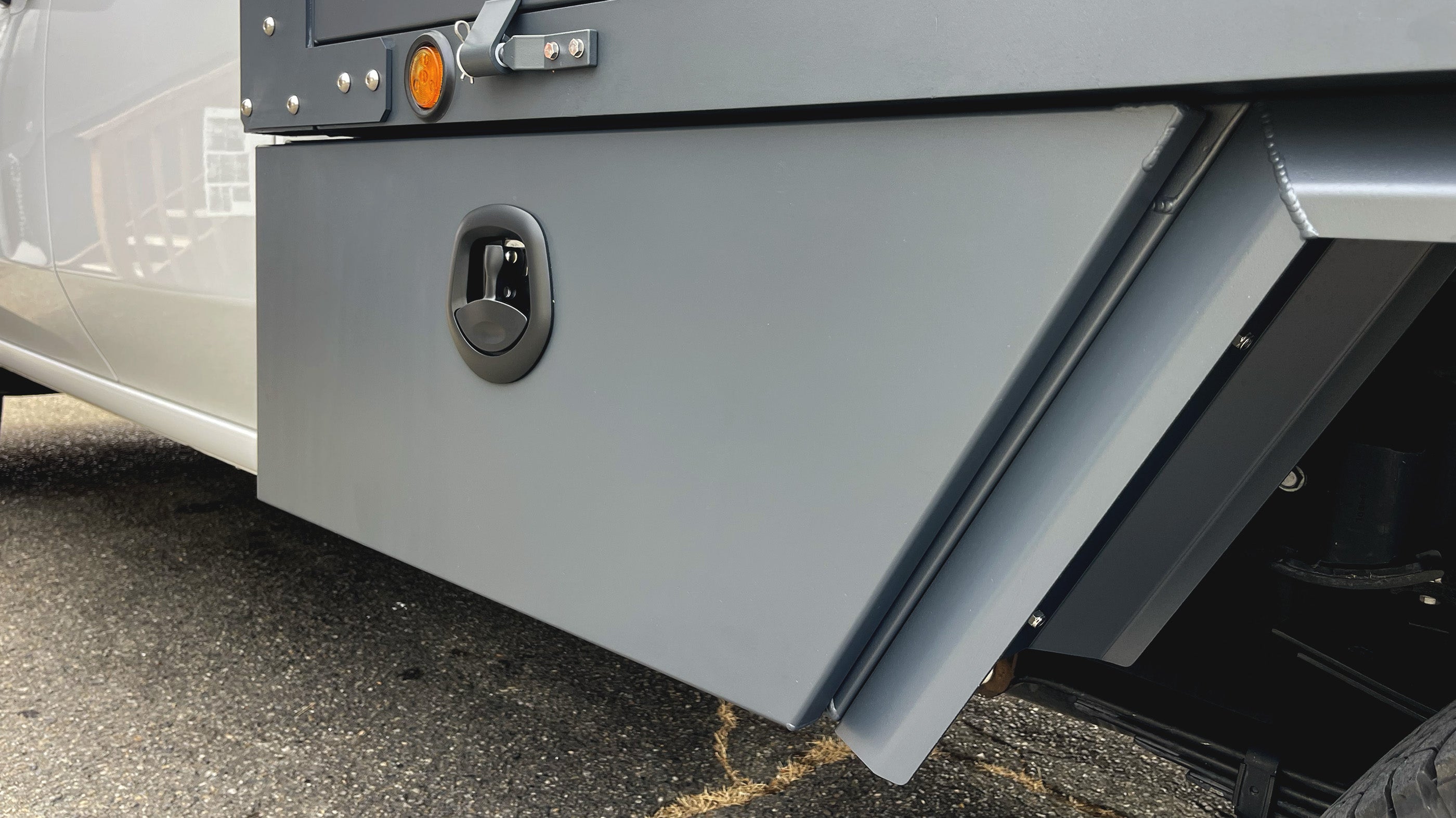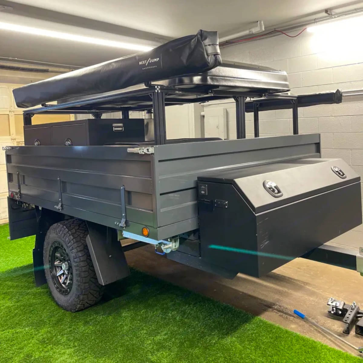 Next JumpFull-Size Long Bed -86.6"W x 96"L x 21.4"H Flatbed Overland Trailer Chassis Build with detachable drop sides and Australian Jacks.